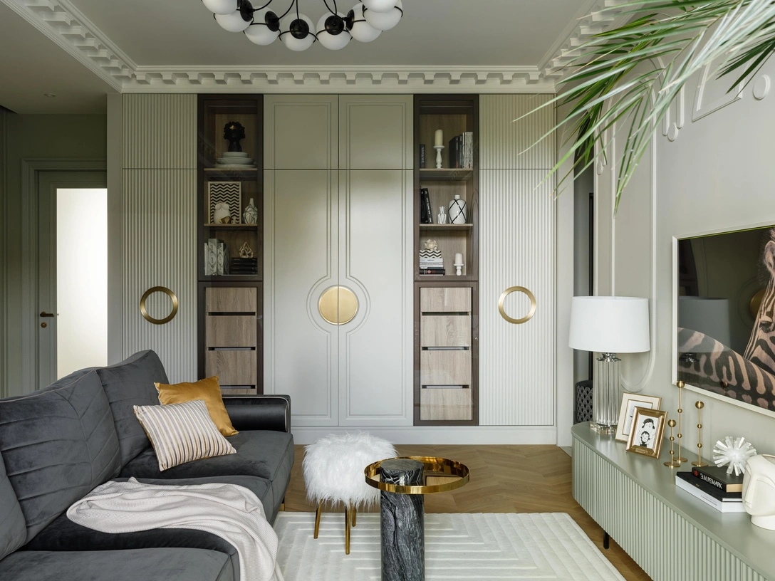 Квартира находится в историческом районе, и, учитывая элегантную архитектуру окружающих зданий, мы остановились на стиле ар-деко. Вместо утраченной ранее лепнины, мы разработали новые формы в соответствии с новой планировкой. Фасады встроенных шкафов выкрасили в цвет стен, чтобы растворить их в пространстве, а остальную корпусную мебель подбирали в близких к ним оттенках по принципу градиента. Также, чтобы квартира казалась просторнее, в прихожей и гостиной установили большие зеркала в пол и там, где это было возможно, отказались от дверей.