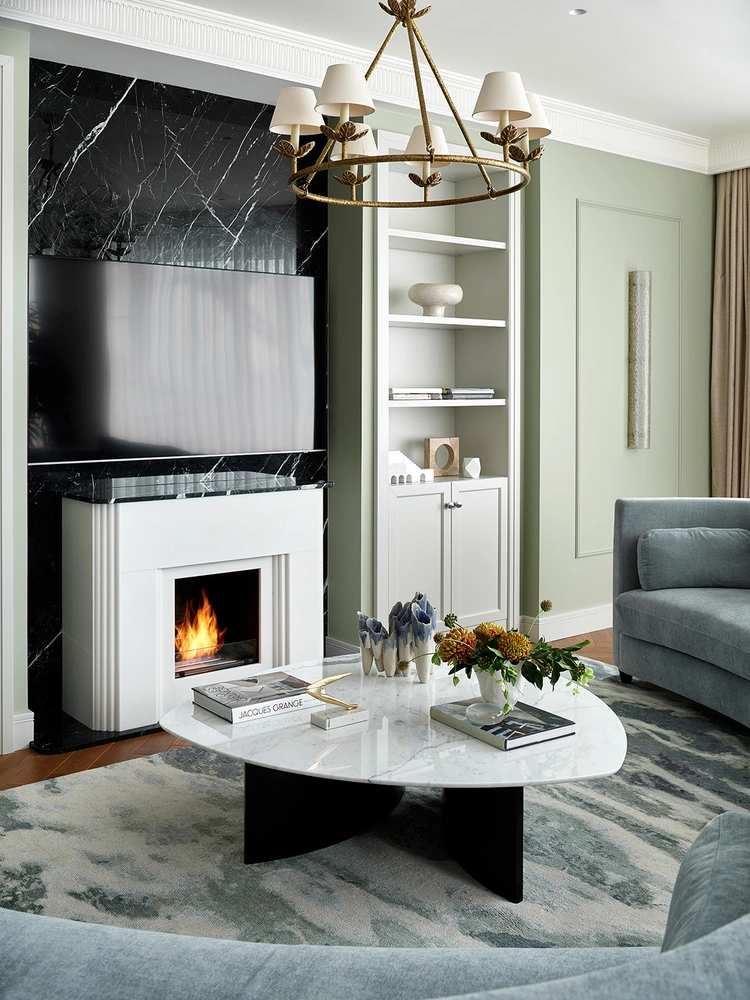 Изогнутую линию остекления повторяют полукруглые диваны. Их дизайн вдохновлен работами Владимира Кагана. Между диванами располагается биокамин — маленькая мечта заказчицы. Портал сделан из белоснежного мрамора, боковые элементы перекликаются с рисунком гипса на колонне и рифлеными фасадами кухни.