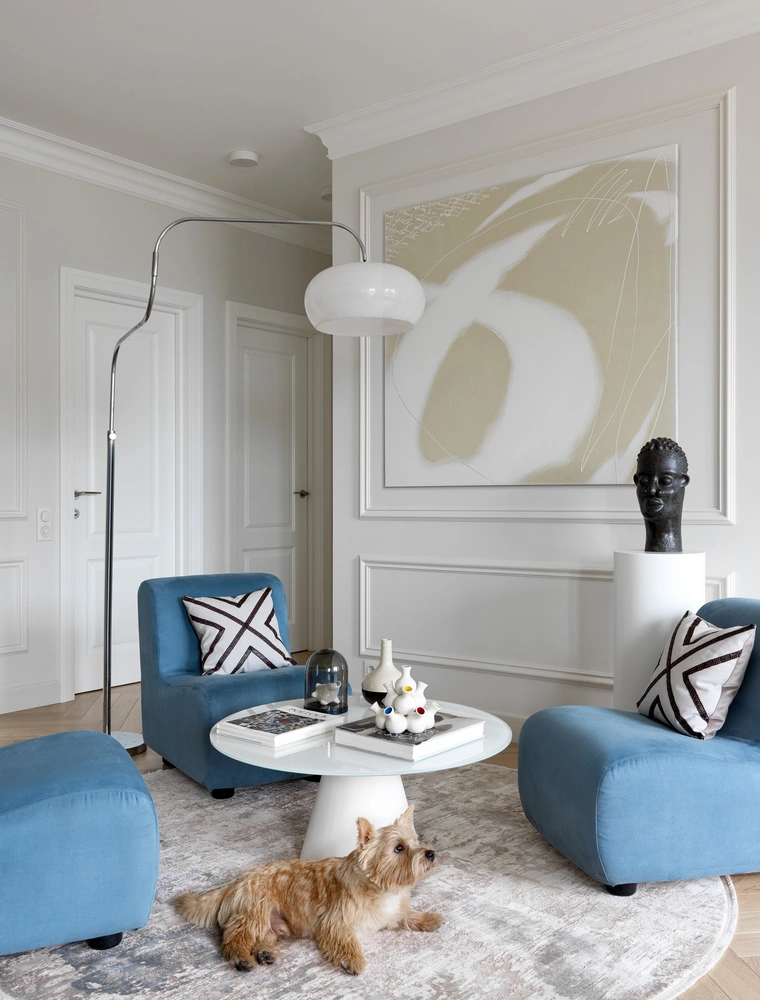В квартире удалось распланировать две гостиные зоны. Одна находится в открытом общем пространстве кухни-столовой. «Мы долго искали подходящий белый оттенок для стен, гипсовой лепнины и потолка. Было сделано невероятное количество выкрасов, заказчики приезжали смотреть их в разное время суток, при разном освещении, погоде, прежде, чем был найден идеальный цвет».