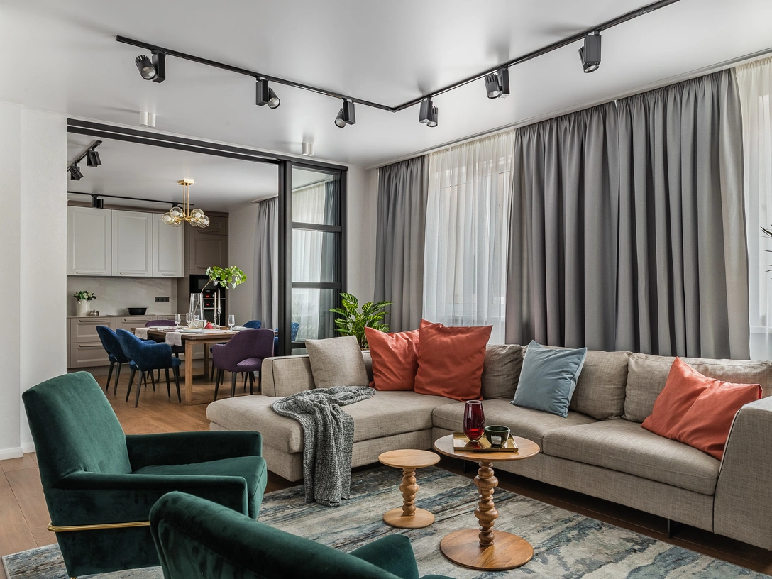 «Гостиная стала проходной зоной между столовой и приватной частью квартиры. Здесь расположился большой диван и биокамин, который мы встроили в короб, облицованный керамикой под мрамор. Тем же материалом оформлены столешницы и фартук в кухне. Большую часть пространства занимает обеденный стол и цветные кресла в синем и фиолетовом оттенках».