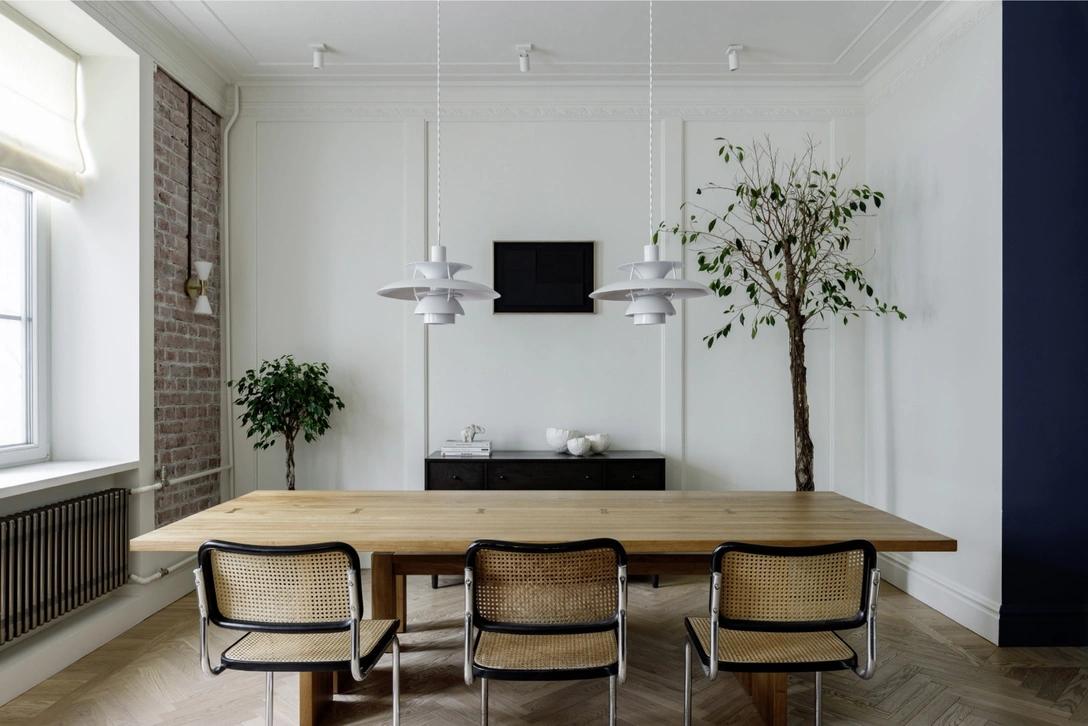 Квартира площадью 150 квадратных метров расположена в известном «Доме с масками» рядом с площадью Разгуляй, на одной из самых красивых и сохранившихся улиц Москвы — Новой Басманной. Это бывший доходный дом купца Михаила Мальцева, построенный по проекту мастера модерна Николая Ивановича Жерихова. Сегодня, как в старые времена, из его окон часто доносится живая музыка — хозяин квартиры увлекается игрой на фортепиано, но сам интерьер приобрел современные черты с элементами скандинавского дизайна, открытой кирпичной кладкой и стеклоблоками.