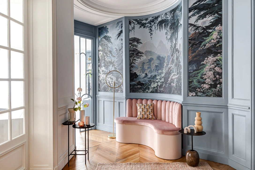 «Мы старались использовать буквально каждый сантиметр, уделив большое внимание планировке всех комнат. Для начала расширили холл; здесь была идея избавиться от скругленной стены, но потом приняли решение оставить все как есть и пристроили к ней изготовленную на заказ скамью. Затем выкрасили стену в сложный серо-голубой цвет Bleu Tahoe — этот оттенок мы позаимствовали у исторической панорамы „Эдем“, переизданной обойной мануфактурой Le Grand Siècle», — рассказывает Мари Ле Магересс.