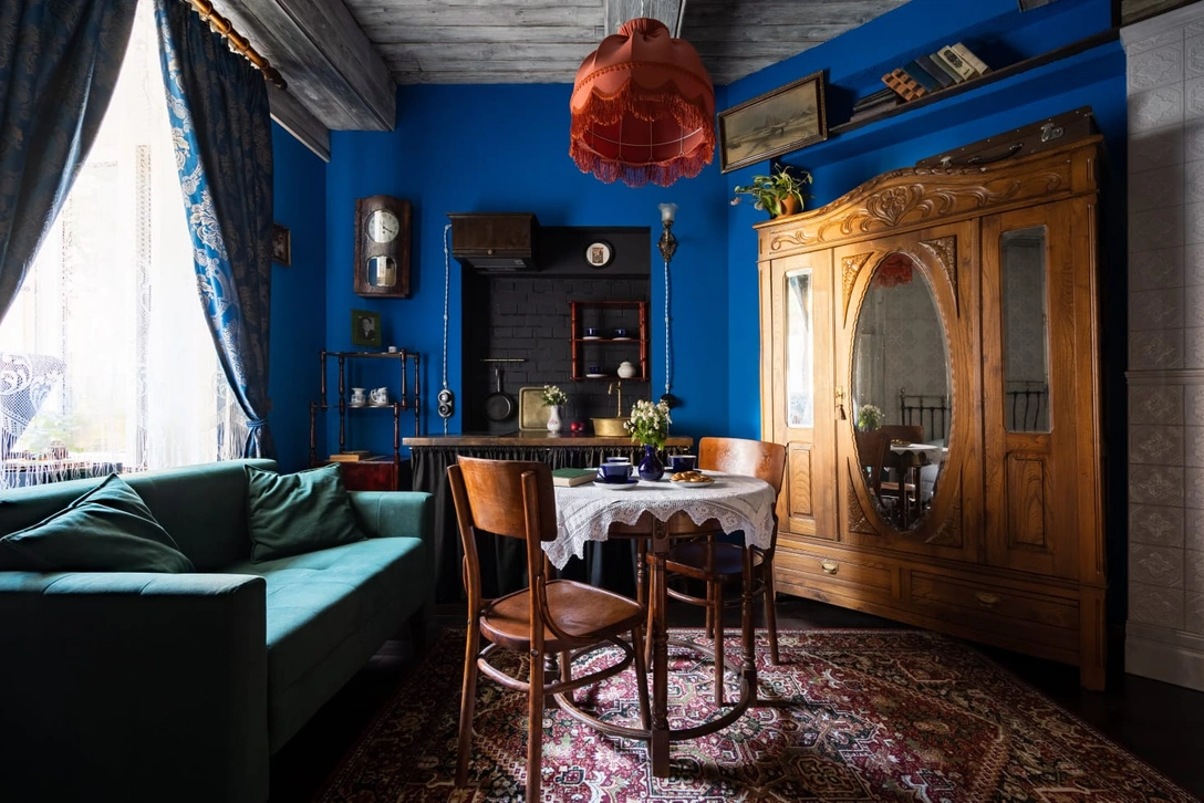 «Практически каждый предмет в интерьере имеет свою историческую ценность и легенду. Все внимание в основной части пространства привлекает дубовый трехстворчатый шкаф, украшенный фацетными зеркалами французской мануфактуры L’Ideal 1897 года. Рядом располагается дореволюционный стол из красного дерева, который дополняет пара стульев братьев Конъ. Для полного погружения гостей в ту эпоху мы попытались воссоздать копию белоглазурованной печи в стиле неоренессанса, которые были распространены в доходных домах Петербурга рубежа XIX–XX века».