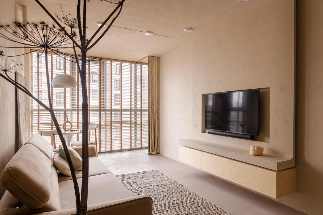 Вдохновением послужили пещеры Ласко и Шове на юге Франции, известные своими наскальными рисунками. Чтобы создать в квартире атмосферу спокойствия и умиротворения, дизайнер использовала близкие к природе цвета и фактуры. Стены и потолок оформлены декоративной штукатуркой теплого бежевого оттенка, а пол — микробетоном. Из-за отсутствия традиционных плинтусов и карнизов кажется, будто покрытия перетекают с одной поверхности на другую. Их красивый рельеф подчеркивает встроенная подсветка и точечные светильники.