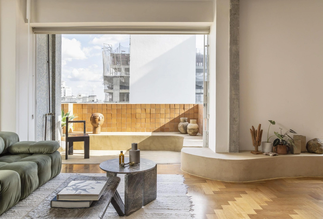 «Клиент хотел гармоничный и спокойный интерьер, поэтому в этом проекте мы соединили разные натуральные материалы», — говорит дизйанер Андре Браз (André Braz). За основу взято дерево фрейхо, дополнено белой штукатуркой, бетонными балками и колоннами и терракотовой плиткой на балконе.