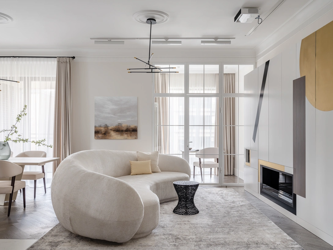 «Сердцем дома стала гостиная с огромным четырехметровым диваном, на котором можно валяться всей семьей. Напротив него находится шкаф. Вдохновленный работами Кандинского, он представляет собой супрематическую композицию со вставками из латуни, шпона эвкалипта и черной эмали. По центру располагается биокамин, а за белыми глянцевыми фасадами спрятаны полки — у хозяев большая коллекция книг по искусству».