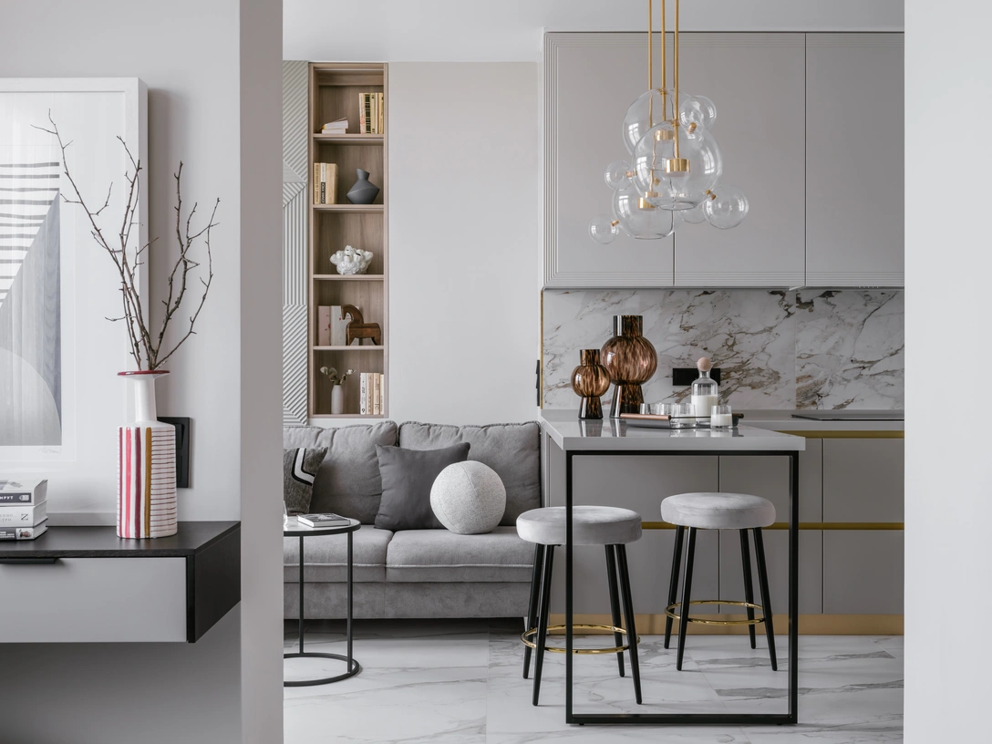«Минимализм с элементами классики — так бы я охарактеризовала сочетание используемых материалов и предметов мебели. Прямые черные линии, созданные теневым профилем на полу, кантом на шторах и опорами кухонного острова, однотонные гладкие стены и лаконичные фасады шкафов в спальне и прихожей — все это строгая минималистичная база. В то же время классические детали — объемные стеновые панели, золотые и латунные акценты — придают интерьеру легкости и шарма».