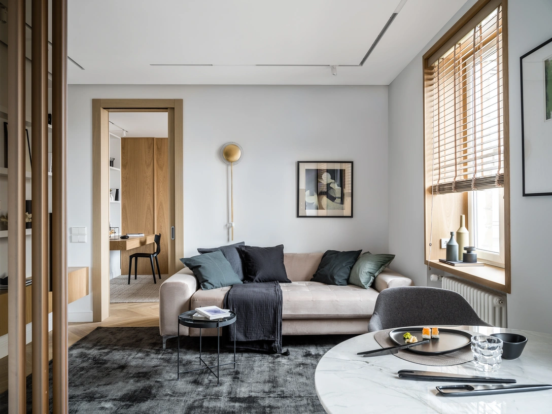 Особое внимание мы уделили материалам и фактурам. Заказчик хотел добавить в интерьер шпонированные панели, но так как квартира небольшая, мы сделали это деликатно — деревом отделаны оконные откосы и часть стены в спальне, которая зрительно отделяет зону для сна от рабочего места.