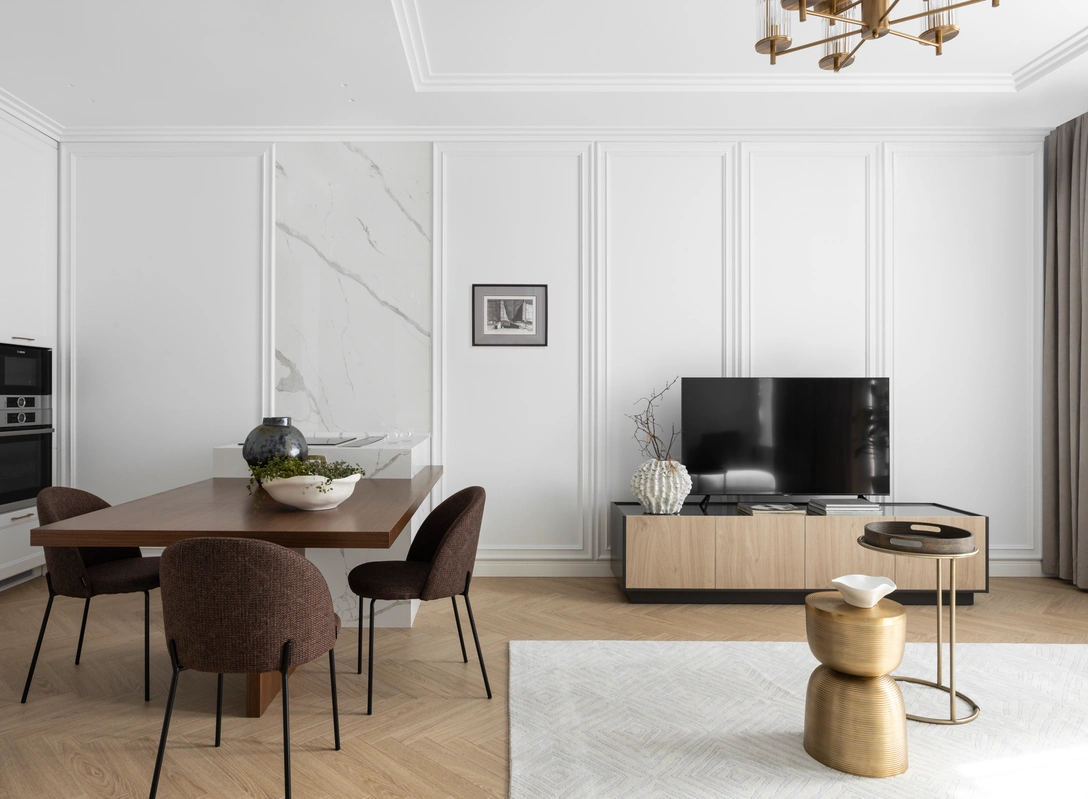Успокаивающее симметричное расположение молдингов на стенах и зеркальная панель в углу за диваном в гостиной создает ощущение продолжения пространства. Отражающийся свет из окна добавляет естественного освещения в комнату.