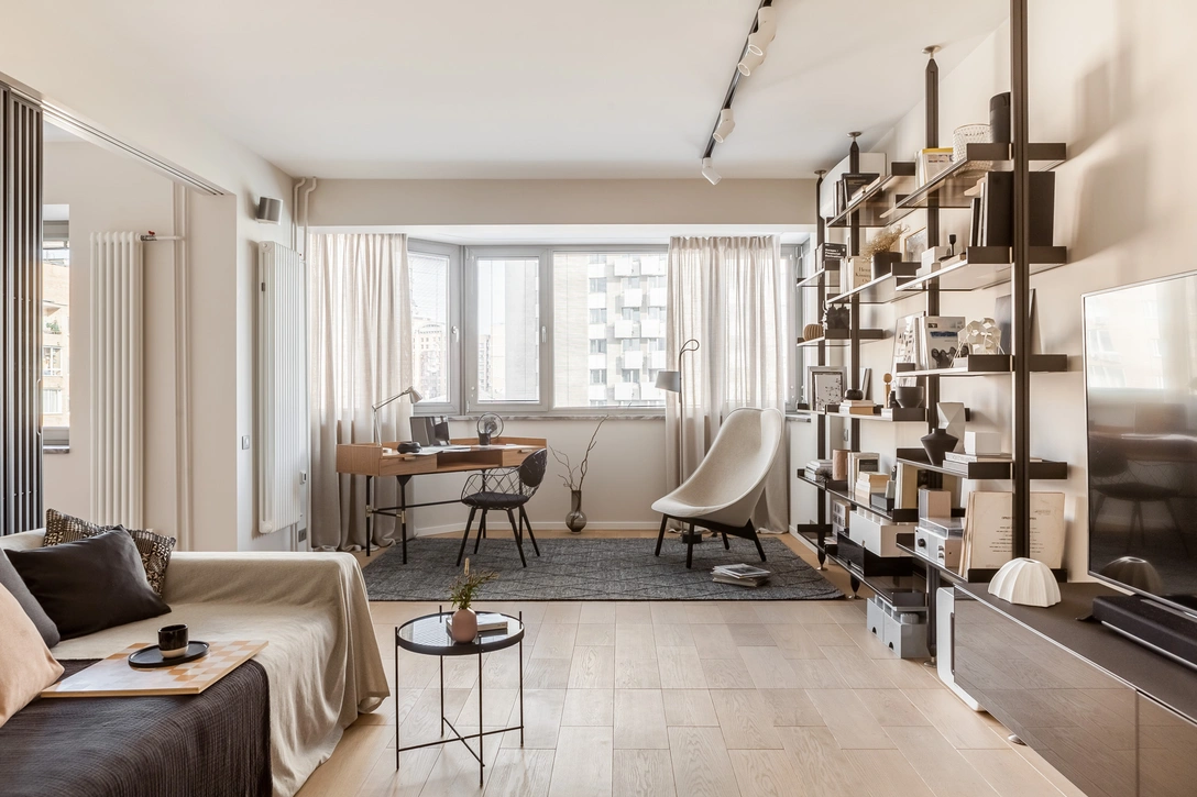 В зоне гостиной было важно разместить большое количество книг и предметов декора, привезенных из путешествий или подаренные друзьями. Расставленные на открытых полках они становятся неотъемлемой частью интерьера. Все полы в квартире покрыты дубовым паркетом, который связывает все функциональные зоны в единое целое.