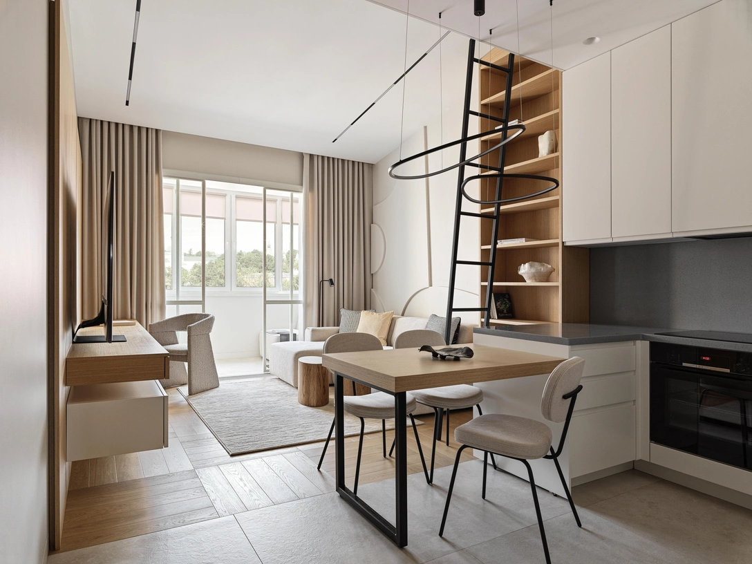 Еще одна особенность квартиры заключается в том, что она находится под скатной крышей — высота потолков в коньке достигает 4,5 метров. Стремясь максимально задействовать пространство, мы спроектировали над кухней вместительную антресоль с акцентной черной лестницей. Фасады специально сделали минималистичными, со скрытыми фрезерованными ручками, чтобы эта часть помещения не перетягивала на себя все внимание.