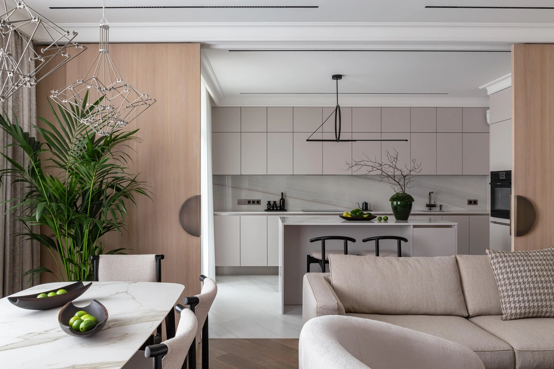 «Эта квартира принадлежит семейной паре стоматологов. Заказчики много путешествуют и во время своих поездок останавливаются в пятизвездочных отелях. Для них очень важен комфорт, чтобы каждая вещь была на своем месте. Обратившись к нам, они попросили создать максимально светлый и функциональный интерьер, не перегруженный деталями», — рассказывает дизайнер Олеся Решетникова.