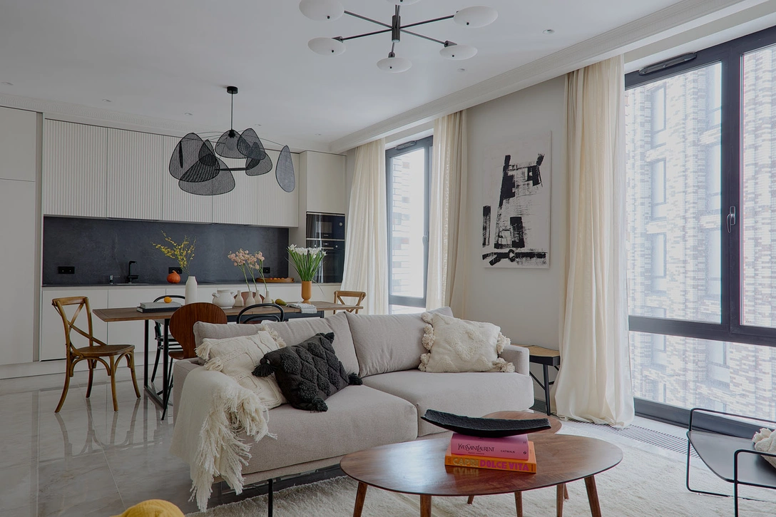 «Планировка была свободной. Мы стремились распределить пространство таким образом, чтобы все комнаты получились достаточно просторными и светлыми. Сейчас в квартире есть объединенная кухня-гостиная со столовой зоной, спальня, две гардеробные и ванная комната».