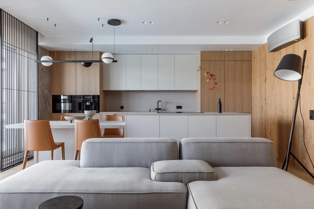 «Наше любимое место в этой квартире — кухня-гостиная. Центр пространства занимает диван. Он очень удобный и при своих немаленьких размерах не выглядит громоздким. За ним находится кухня. Часть фасадов оформлена шпоном, который идеально сочетается со стеновыми панелями. Кухонный остров со встроенной вытяжкой и винным холодильником плавно переходит в обеденный стол. Той самой „вишенкой на торте“ в интерьере стала мобильная металлическая перегородка на окне. Она скрывает пространство от посторонних глаз, а в солнечный день создает красивые геометричные тени».