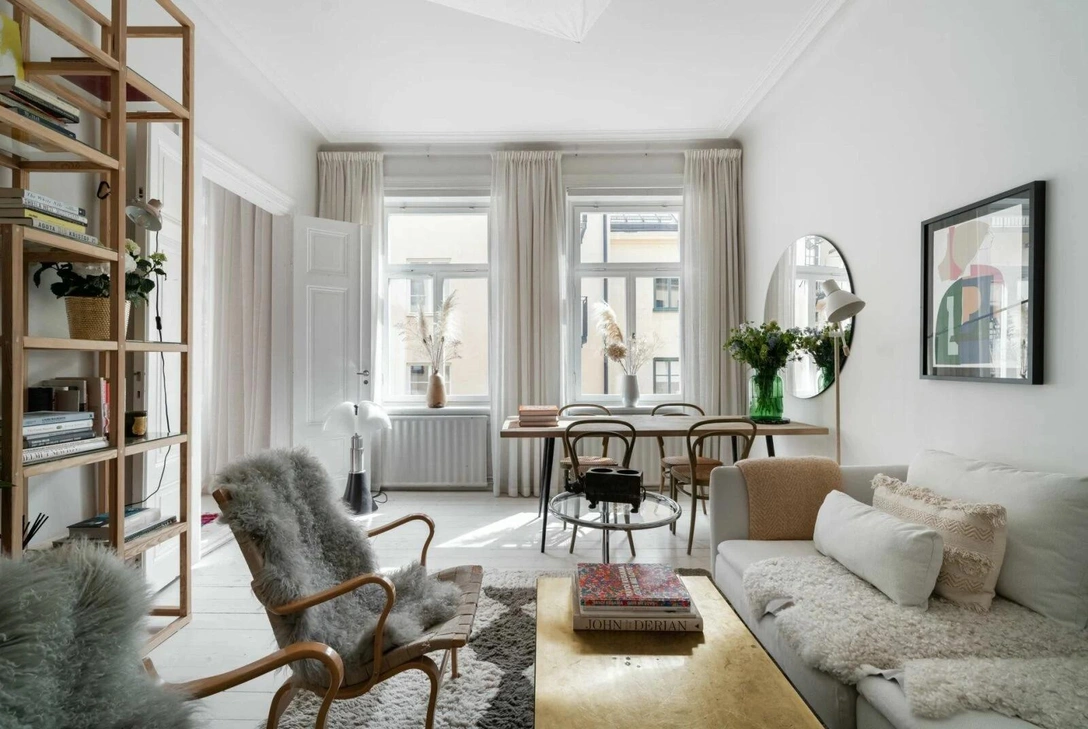 Квартира модельера Карин Родебьер (Carin Rodebjers) находится в доме 1898 года, где сохранилось очарование рубежа веков — большие окна, высокие потолки, историческая лепнина. Карин вдохновилась мягким светом, льющимся в комнаты сквозь большие окна, и выбрала для интерьеров «скандинавскую» палитру с легкими, сдержанными красками — от белого и бежевого до спокойного серого и оттенков дерева.