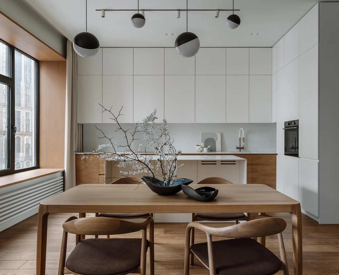 «Гостиная объединена с кухней и столовой. В этой комнате заказчики проводят большую часть своего времени. Здесь всегда много гостей, вкусно пахнет едой, и играет отличная музыка из встроенных потолочных колонок. Интерьер выполнен в спокойной гамме, строящейся на сочетании белого и цвета натурального дуба, из которого выполнена часть мебель и стеновые панели. Еще деревом мы оформили оконные откосы и подоконники. Последние получились настолько широкими, что на них можно лежать даже вдвоем».
