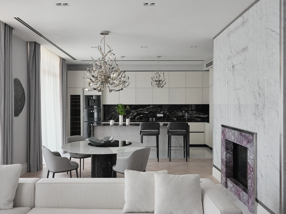 Изменения затронули почти все комнаты. Цветовую палитру сменили на любимые владельцами серо-фиолетовые тона, что дало ощущение воздуха и простора. Гостиную дизайнеры решили сделать образцом хорошего вкуса, не забывая про комфорт. Главной изюминкой интерьера стала консоль, выполненная на заказ. Она украшена деталями из пирита, которые, переливаясь на свету, мгновенно привлекают внимание. С зоне кухни-столовой дизайнеры добавили подвесные светильники с изогнутыми элементами, которые напоминают листья пальмы.
