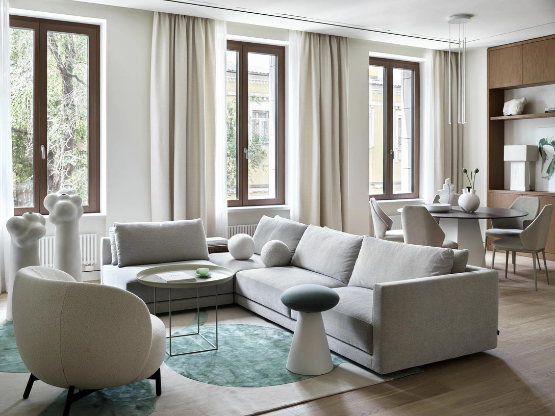 При выборе новой квартиры, одним из важнейших параметров для заказчиков — семейной пары с двумя детьми — был вид на зелень. Они хотели чувствовать себя так, будто они находятся не в шумном мегаполисе, а далеко за городом. Мы долго искали подходящий вариант и уже было отчаялись, как однажды заказчики, гуляя по Замоскворечью увидели новый дом и зашли посмотреть. На удивление из больших окон квартиры на втором этаже открывался вид на скверик на тихой улице, что создавало полное ощущение жизни в собственном саду!
