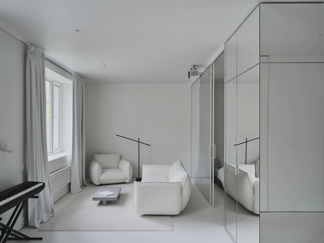«Хозяева квартиры, молодая пара, попросили создать чистый светлый интерьер без визуального шума и открытого хранения, — рассказывают основательницы бюро А77 Ксения Карабанова и Кристина Кирсенко. — В основу концепции легла идея взаимодействия геометрических объемов, света и отражения. Пространство формируют белые объемы стен, которые прерываются стеклянными вставками с подсветкой. Зеркальные объемы добавляют игру отражений».