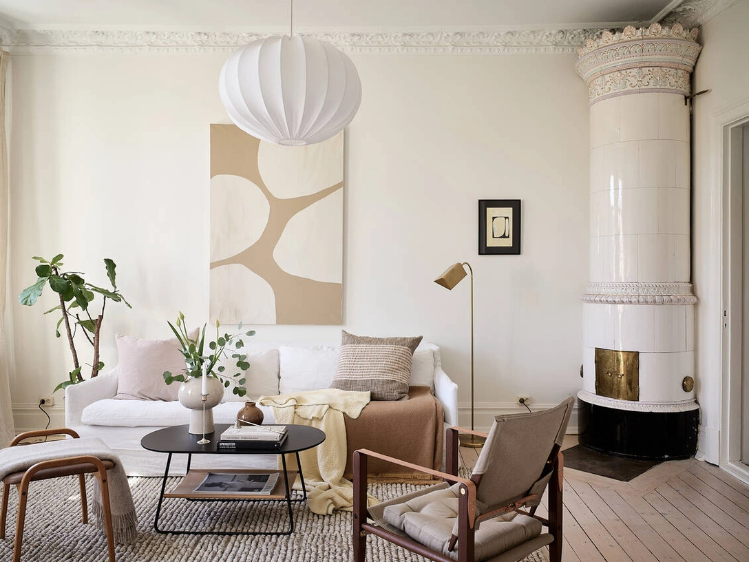 Гостиная — самое светлое пространство, здесь много места, а солнечные лучи отражаются от стен, выкрашенных в нежный кремовый цвет. В одном из углов архитекторы сохранили старинную изразцовую печь — сейчас она выполняет только декоративную функцию, так как при ремонте здания все коммуникации обновили. Почти не уступает размерами и отделенная распашными дверями спальня, в которой также оборудован кабинет — благо естественного света здесь достаточно.