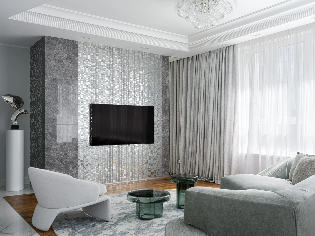 Хозяева квартиры — активные молодые люди, увлекающиеся вейксерфингом и другими видами спорта. Они хотели, чтобы помещение было оформлено в светлых тонах «с элементами блеска и хрусталя, чтобы в нем были приятные текстуры и все немного сверкало». Поэтому в отделке мы использовали серебряную мозаику и муранское стекло — фасады гардероба при входе выполнены с серебряной поталью и сочетаются с серебряной мозаикой/панно за телевизором.