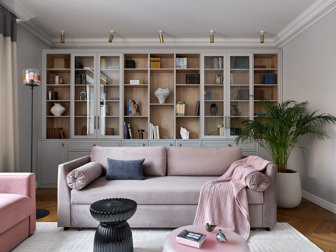 Хозяева — любители классики, поэтому в проекте использовано много классических деталей: лепнина на стенах, филенки в мебели, широкие карнизы и плинтусы, белые двери с фацетным стеклом, латунь и муранское стекло. Прекрасным фоном для классического интерьера в гостиной служит библиотека у дальней стены, изготовленная на заказ для этого проекта. А чтобы обстановка не выглядела слишком старомодной, в интерьер добавлены стильные светильники, красивые шторы из итальянского шелка с кантом, лаконичный белый ковер и современная керамика на полках.