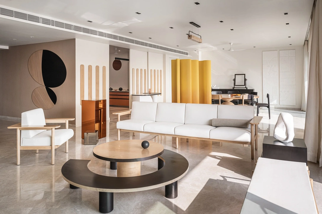 Студия The Act of Quad объединила две квартиры, расположившиеся в высотном здании в пригородном районе Мумбаи, чтобы создать комфортный дом для жизни трех поколений. На площади 325 кв.м находится гостиная, объединенная со столовой, кухня, четыре спальни, молитвенная комната, кабинет и домашний кинотеатр. Дизайнеры постарались адаптировать планировку к потребностям каждого члена семьи, сделав пространство максимально гибким и многофункциональным.