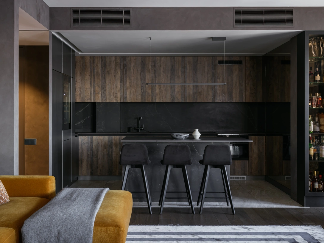 Заказчики любят устраивать званые ужины и домашние вечеринки, поэтому основной задачей было разделить апартаменты на приватную зону и пространство для приема гостей. Так сердцем дома стала гостиная с большим диваном и обеденным столом в отделке из микробетона. Здесь же располагается кухня.