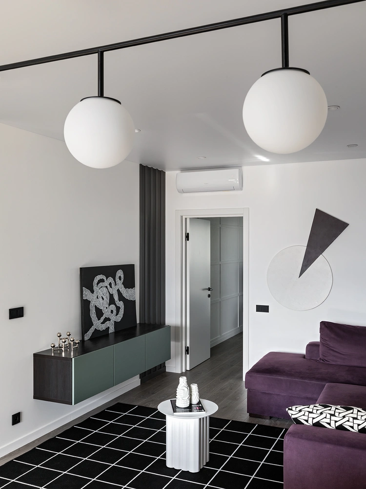 Заказчики, устав от нейтральной классики собственной квартиры, мечтали об атмосфере динамичной городской жизни, при этом желая сохранить лаконичность. Отправной точкой в проекте стал диван насыщенного баклажанового цвета, который заказчики хотели обязательно интегрировать в интерьер. В пару к нему дизайнер подобрала клетчатый ковер, который показал, каким может стать основной мотив — полосы, геометрия, строгость линий.
