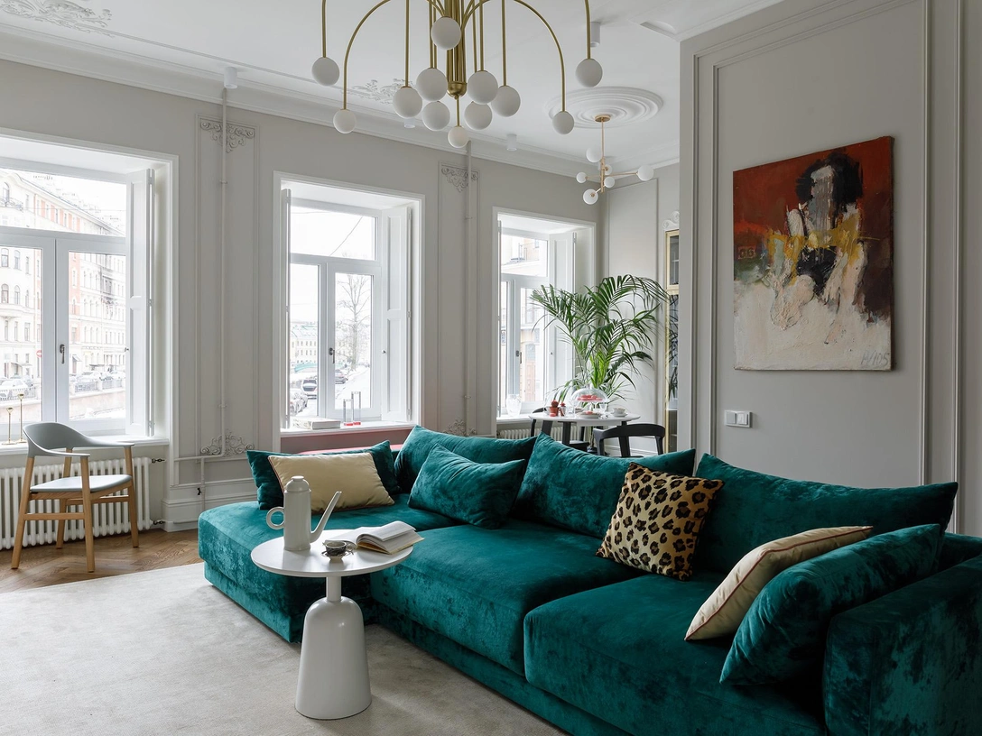 Второй задачей было создать в интерьере атмосферу «типичного Питера» (формулировка дизайнера). Решить ее помогла сама квартира с ее высокими потолками и окнами, а еще больше усилили этот эффект двери с декоративными порталами, лепнина, которой щедро украшены стены и потолки в гостиной и спальне, и цветовое решение — в его основе характерные для северной столицы серые тона.