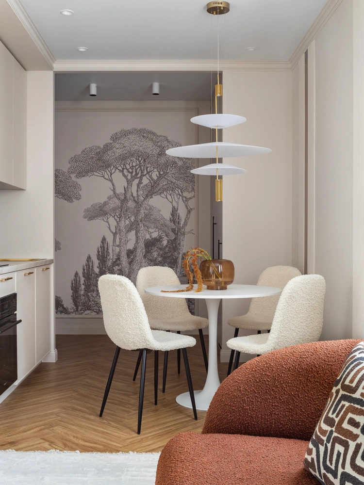 Кухня находится в нише, фасады выполнены в одном оттенке со стенами. Встроенный холодильник прячется в шкафу за простенком, прилегающим к кухне. Ящик под приборы разместили под варочной поверхностью и над духовкой, поскольку возможности вынести технику в колонну не было. Обеденную зону выделили подвесным светильником, придав ей нарядности.