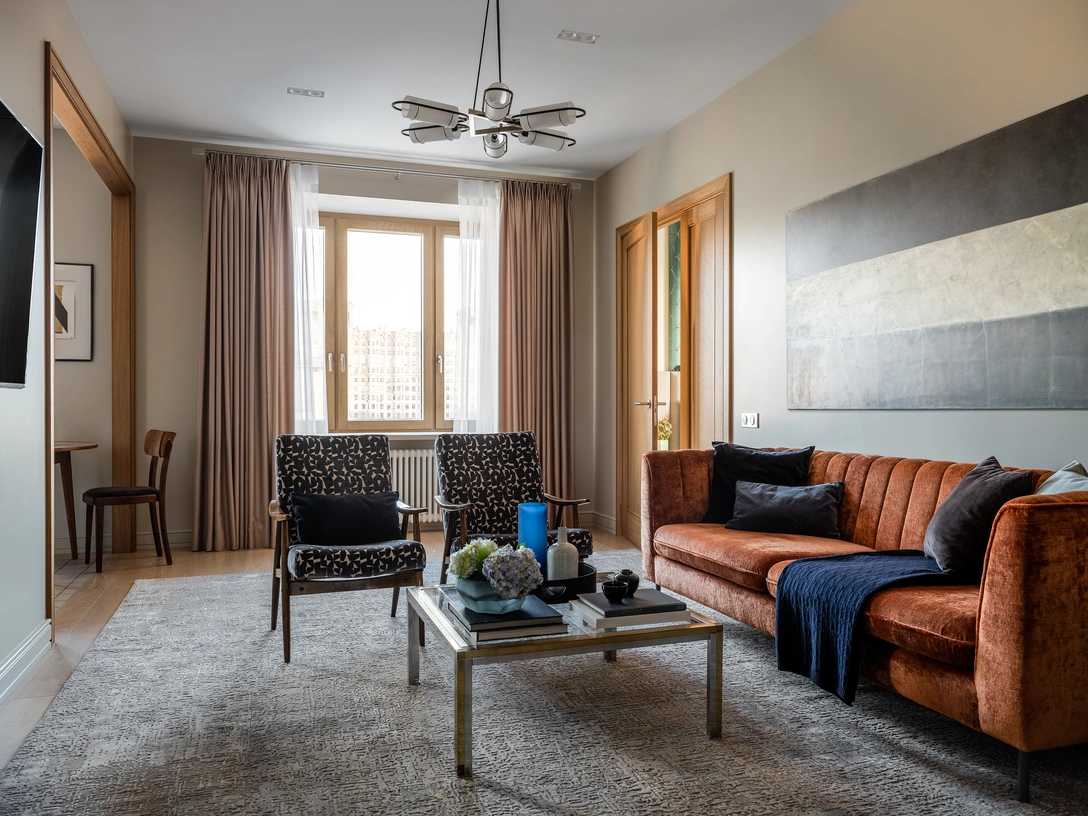 Нейтральный цвет стен и гладкие шпонированные поверхности мебели и дверей служат фоном для акцентных элементов отделки. Оптические орнаменты панно над изголовьем кровати, обивки кресел в гостиной, штор в кабинете и плитки, которой отделан кухонный фартук, перекликаются друг с другом, объединяя разные комнаты общей стилистикой. Простая квадратная плитка, которой отделана ванная комната и пол в кухне напоминает об эстетике 1980-х годов. Винтажные светильники и мебель, часть которой сохранилась в квартире с конца 1960-х годов, придают интерьеру аутентичный вид.