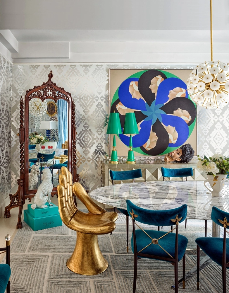 Так, для гостиной Джонатан подобрал ковер в черно-белую шашечку, напоминающий линолеум, и известные диваны от Владимира Кагана (Vladimir Kagan), переобив их кремовым букле. Мизансцена в столовой: старинный керамический пудель в натуральную величину (подарок Майкла Корса) смотрится в зеркало в резной раме с пинаклями. Постаментом для скульптуры служат коробки Tiffany & Co. Винтаж? Тоже да!