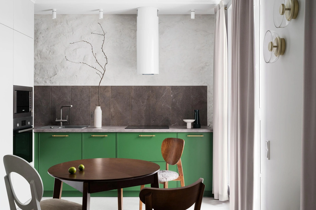 «Главным акцентом в основном пространстве стала кухня, выполненная в достаточно ярком зеленом оттенке. При этом нам не хотелось, чтобы она выглядела громоздкой, поэтому мы отказались от верхних шкафов: все хранение и технику я переместила на одну сторону, спрятав в мебели, максимально приближенной к цвету стен. Фартук сделан из плитки под камень насыщенного коричневого оттенка, а стена над ним покрыта декоративной штукатуркой с фактурой скалистой породы. Получилась очень интересная игра цветов и материалов. Особенно эффектно такое оформление смотрится в вечернем освещении».