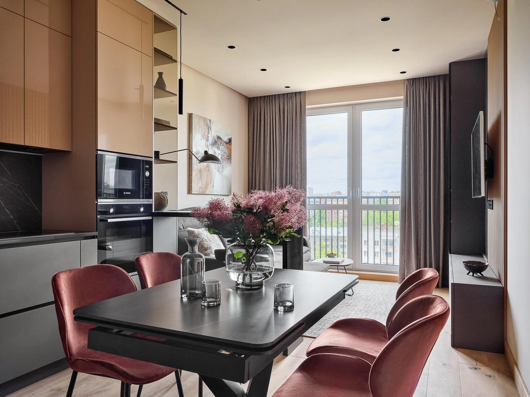 Из окон некоторых комнат виден терракотовый фасад дома напротив, а интерьер, на мой взгляд, не может идти в разрез с экстерьерным окружением. Так и родилась идея деликатно «внести» в квартиру оттенки терракоты, но не впрямую, а использовать довольно насыщенный, теплый, карамельно-кофейный цвет в прихожей и терракотово-медные акценты в интерьере кухни и гостевого санузла.