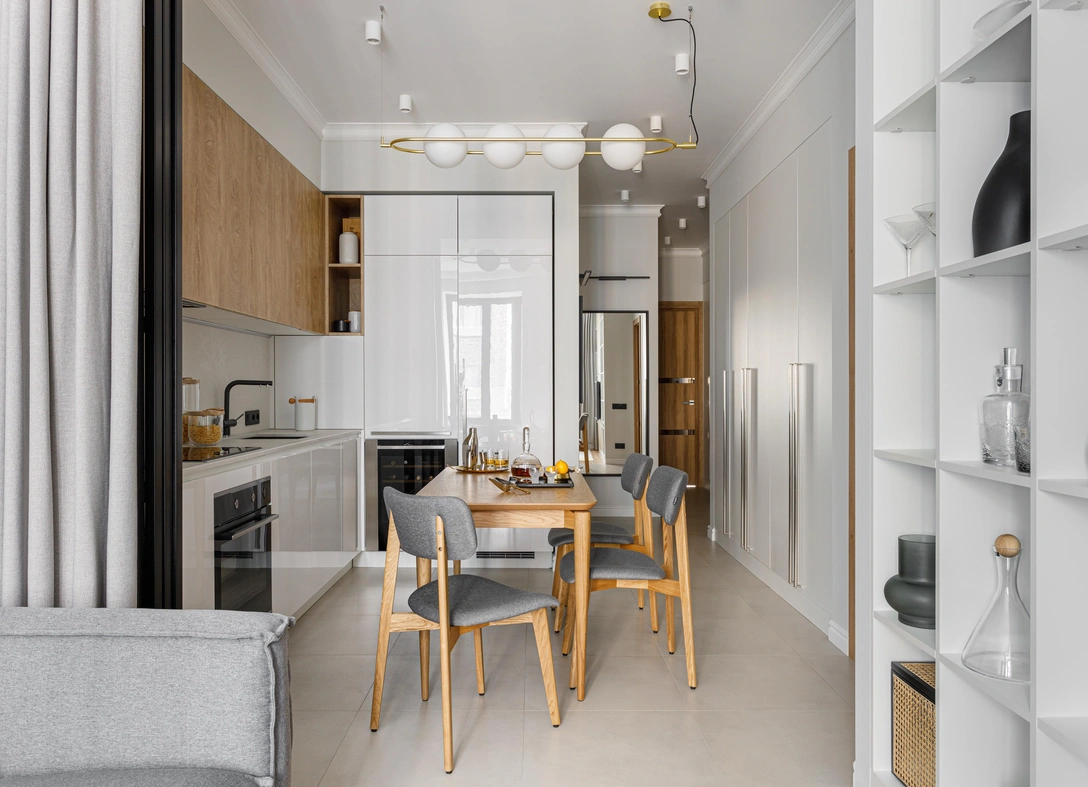 Зона кухни гостиной условно разделена раздвижной перегородкой. Большую часть времени она открыта и практически незаметна, но при необходимости превращается в отдельную полностью изолированную комнату. Расположение обеденного стола и его размер высчитывали по миллиметрам, так как с одной стороны от стола располагается зона приготовления еды, с другой стороны — основной проход в гостиную и спальню.
