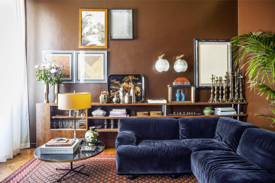 Ограниченные ресурсы — в первые дни весны Эмилиано оказался в своей новой квартире буквально с несколькими банками краски, парой отрезов ткани в руках и распакованной коллекцией любимого винтажа — не помешали дизайнеру создать сложный эклектичный интерьер. Например, гостиная: стены выкрашены в темно-бордовый, дневной свет отсекают шторы из металлизированной ткани, черные двери и окна. Обстановка составлена из стола красного дерева по дизайну американского модерниста Джорджа Нельсона, кресел Пьеро Порталуппи из 1930-х и книжного стеллажа рационалиста Джулио Заппы. «Я создал укрытие, где пережидаю шторм. Как планетарного масштаба, так и личного характера». www.dimorestudio.eu