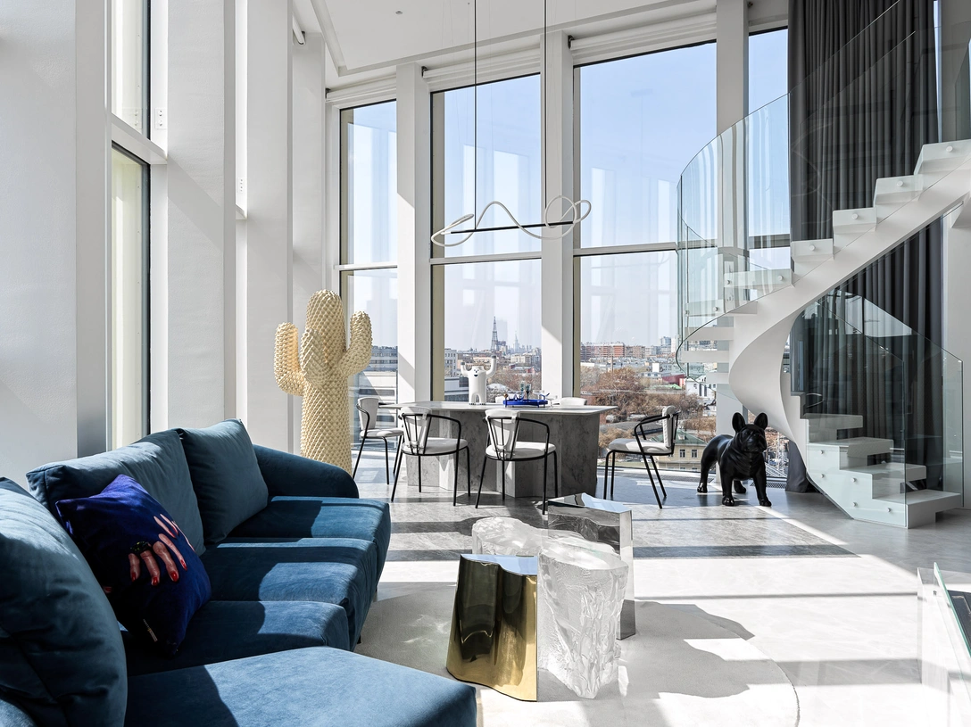 «Апартаменты расположены в „носовой“ части дома, из-за чего панорамное остекление соединяется под острым углом. Не могли обойти стороной необычную форму квартиры, и решили, что линии и параллели станут нашим главным инструментом в работе с геометрией пространства. Пол мы оформили крупноформатным керамогранитом белого и серого оттенка. Грани цветовых зон запараллелены с окнами и визуально делят первый этаж на несколько функциональных зон. Угловой диван в гостиной также повторяет очертания остекления, а обеденная зона заняла главное место — „нос“ квартиры».