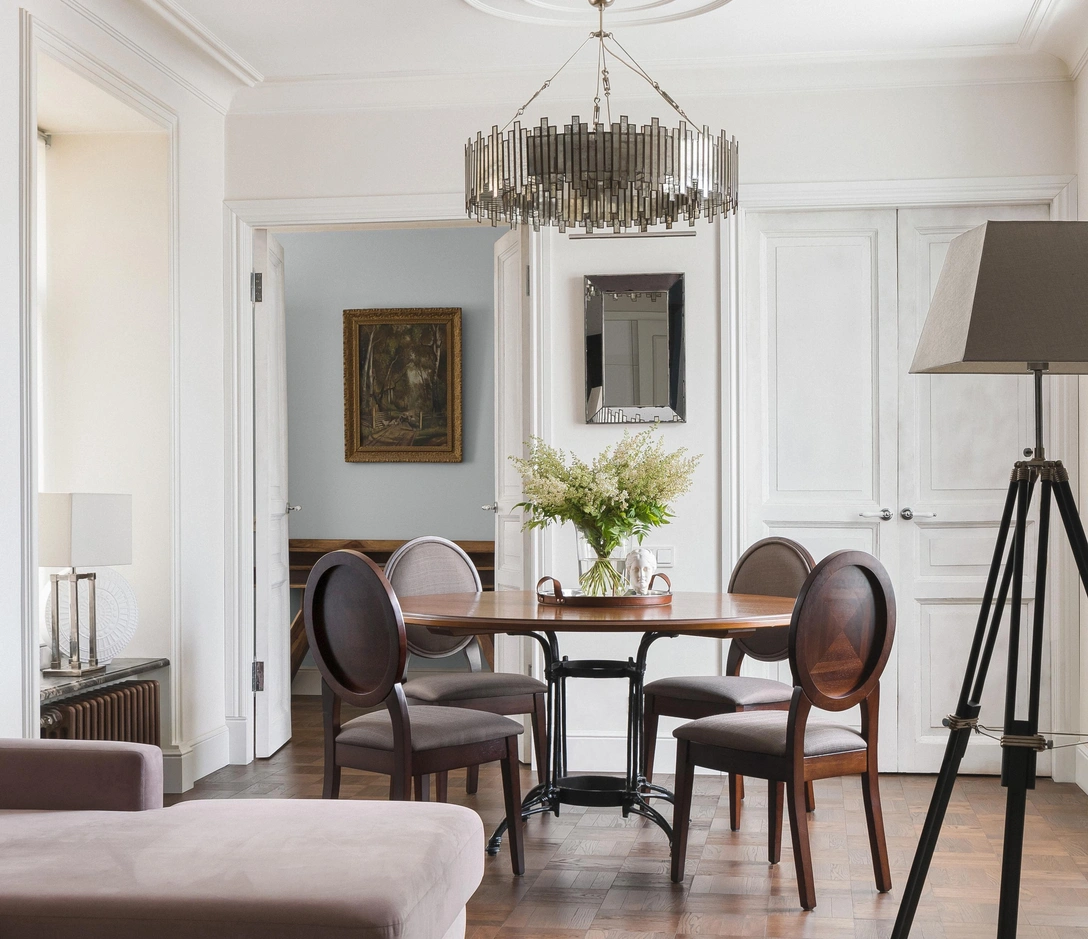 «После демонтажа ненужных перегородок встал вопрос, что делать с историческими полотнами дверей. Решили очистить от старой краски, отреставрировать и приспособить к новой планировке. Таким образом мы получили анфиладную систему с тремя распашными дверями, ощущение единого пространства во всей квартире, воздуха и свободы».
