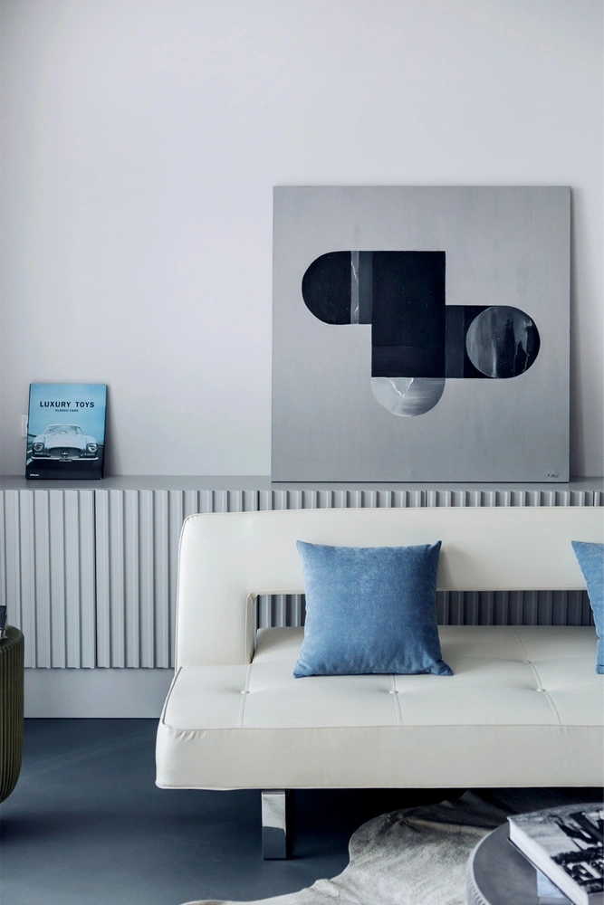 Сложная серая палитра подчеркивает статусность пространства, выдвигает на первый план объекты мебели и искусства