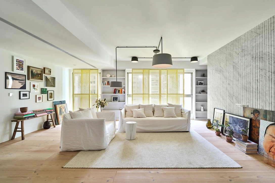 Дочь заказчиков особенно интересуется историей искусств, что вдохновило дизайнеров превратить гостиную в художественную галерею. Картины, постеры и фотографии не только развешены на стенах, но и стоят на полу, небрежно прислоненные к мраморной перегородке. Лаконичный дизайн мебели и светильников удачно подчеркивает «воздушный» характер квартиры.