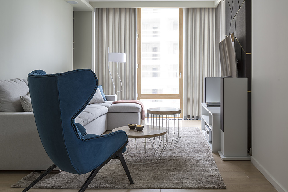 Одним из пожеланий хозяев этой квартиры в современном жилом комплексе было оставить окно в пол в гостиной с красивым видом, которое делало комнату намного светлее и создавало ощущение простора. «Мы были совсем не против, — рассказывают авторы проекта Стас Самкович и Тарас Безруков из студии TS Design. — Действительно, чем больше в гостиную проходит естественного света, тем она уютнее. В этом проекте нас изначально смутило другое. Застройщик рекламировал покупателям дом как современный, построенный по последним технологиям, с привлечением немецких инженеров. Но изучив пространство еще на этапе бетонной коробки, мы опешили. Например, трубы отопления отступали от стен на целых 20 см».