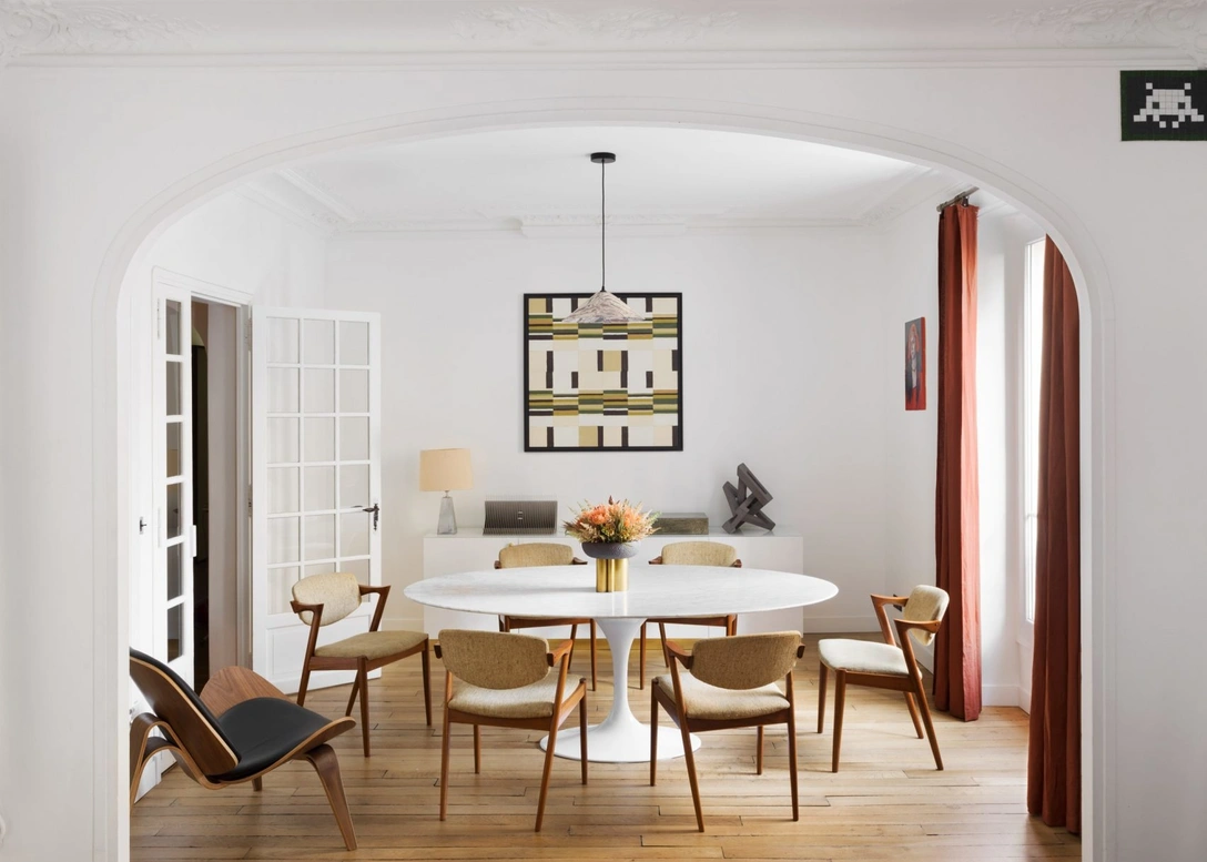Эти апартаменты площадью 100 кв. м в одном из зданий эпохи османизации Парижа раньше были разделены на две квартиры. Чтобы их объединить, архитектор Софи Дрис (Sophie Dries) спроектировала абсолютно новую планировку с входной зоной, коридором и кухней по центру. Везде, где это было возможно, двери заменили открытыми проемами или арками, чтобы сделать помещения просторнее и светлее.