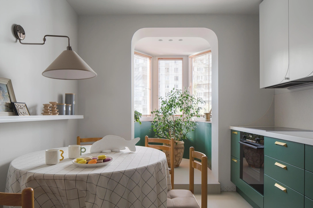 Мы выделили прихожую за счет большого шкафа, который тянется через всю проходную зону. Вход в приватную часть квартиры закрыли стеклянной арочной дверью. Арки в коридоре были сделаны когда-то давно, я их оставила и добавила арки в кухне и входной зоне, а также придала округлую форму балконным проемам.