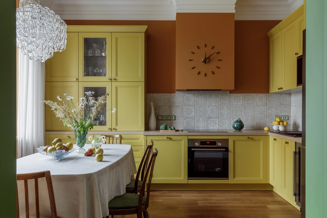 «Для каждой комнаты мы выбрали свою цветовую гамму: в кухне использовали сочетание терракотового и желтого, в гостиной — разные оттенки зеленого, спальню оформили обоями с растительным принтом и выкрасили карниз в терракотовый цвет в красным подтоном, а в детской к достаточно спокойным обоям с изображением животных добавили припыленный розовый оттенок.