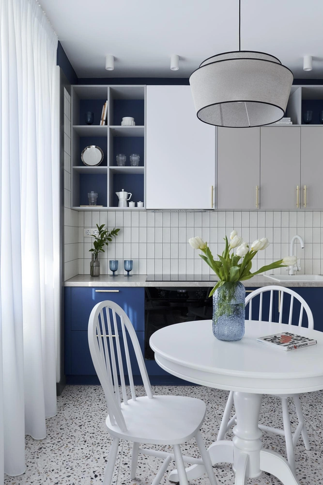 Интерьер выполнен в стиле современной классики с элементами ретро. Центром кухни стал белый стол, окруженный стульями с изогнутыми спинками. «Чтобы визуально разбить обеденную группу, мы взяли стулья взяли двух контрастных цветов — черные и белые. Текстильный абажур над столом поддерживает эту черно-белую историю. Чтобы не утяжелять верх кухонного гарнитура, часть секций сделали открытыми и дополнительно выделили блоки разными цветами, что добавило определенную динамику. Встроенный холодильник и модули хранения разместили в высоких шкафах-колоннах напротив, которые визуально смотрятся как продолжение стены в коридоре».