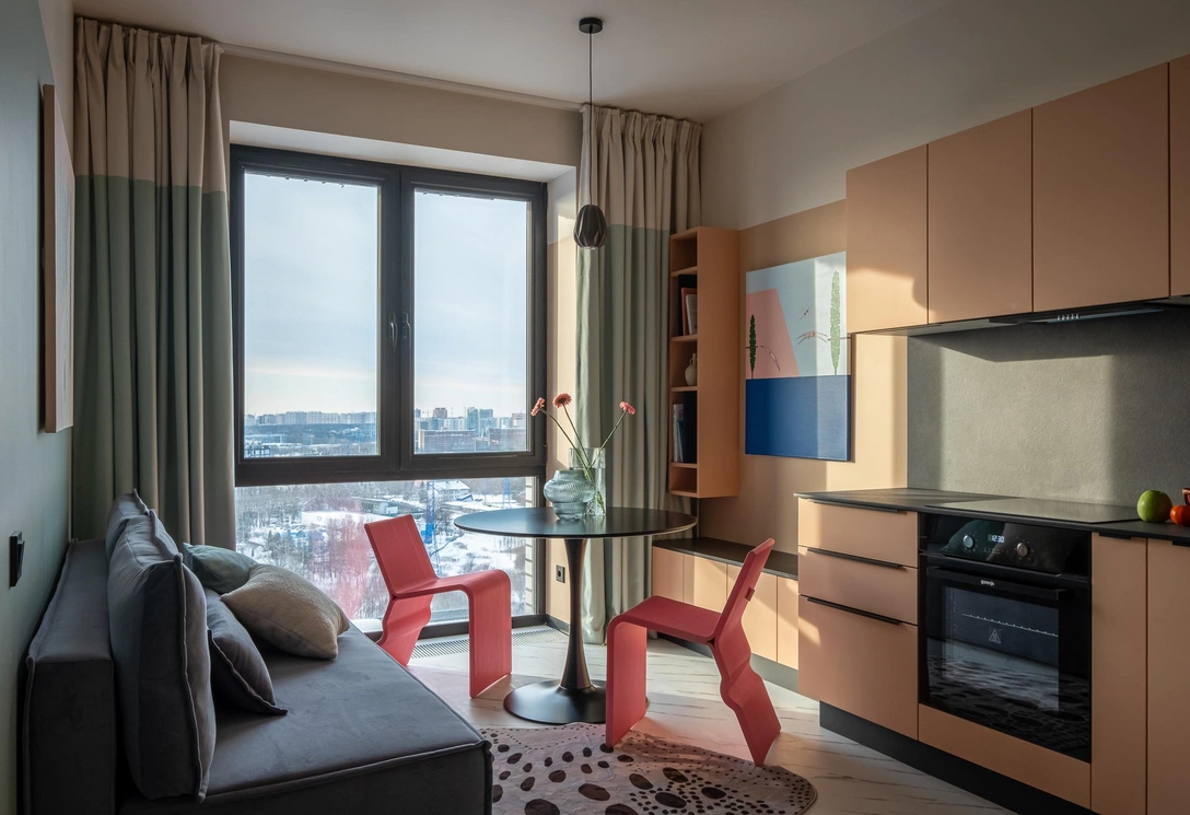 В кухне-гостиной, помимо обеденной группы, удалось расположить раскладной компактный диван. Ярким акцентом здесь стали розовые стулья, выполненные из переработанного пластика с помощью 3D-печати.