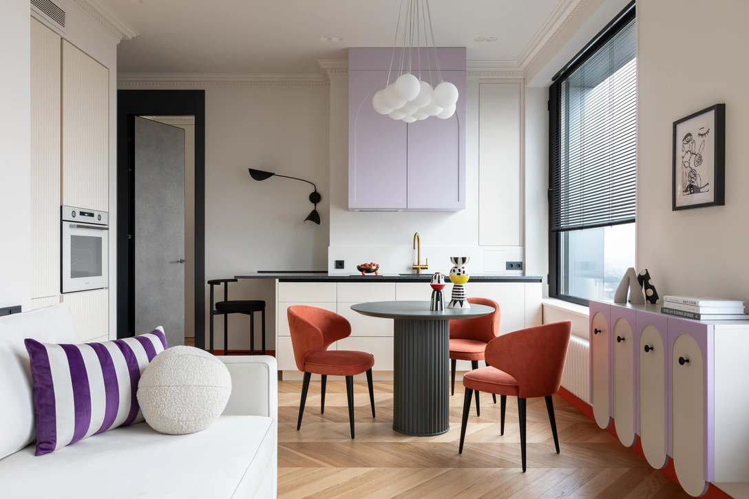 «Вся корпусная мебель в этом проекте сделана на заказ. Акцентом в гостиной стала подвесная тумба, украшенная сиреневыми арками. В том же оттенке выполнен кухонный шкаф, в котором спрятана вытяжка и сушка. Мы хотели, чтобы кухня была незаметной, именно поэтому появилась идея сделать один цветовой объем, вместо обычных шкафов. Холодильник и другая техника спрятаны в нише за фрезированными фасадами, которые тоже особо не привлекают внимание, сливаясь со стеной».