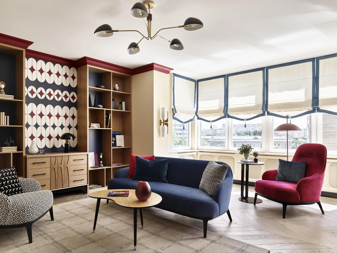 Яркие цвета — не оммаж шестидесятым, а еще одно желание хозяйки дома: в качестве образца она показала дизайнерам свою сумку оттенка яркого бургунди. К сумке были подобраны обивка дивана в гостиной, дверцы шкафов и даже фасады кухонной мебели. В результате все сложилось весьма гармонично, хотя такая выразительная колористика для студии Archbutik стала настоящим вызовом — обычно их клиенты предпочитают более спокойные нейтральные цвета.