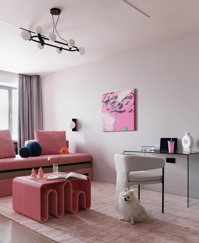 «Цветовая гамма интерьера построена на сочетании разных оттенков розового, однако кухню мы решили выкрасить в насыщенный синий цвет. Также мы добавили природные текстуры, отделав часть кухонных фасадов и фартук под мрамор. Из кухни можно попасть в лаунж-зону на лоджии. Чтобы впустить в пространство больше света, мы убрали подоконный блок и поставили большую раздвижную дверь».